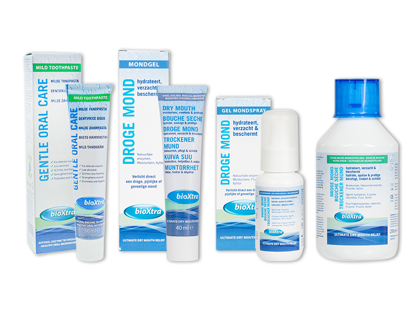 bioXtra producten helpen de symptomen en de gevolgen van Droge Mond (xerostomie) te verminderen. Ze bevatten natuurlijke enzymen ( Lactoperoxidase, Glucose oxidase, Lysozym), Lactoferrine, Colostrum extract, Hydraterende stoffen, Fluoride (behalve in de Mondgel) en Xylitol.
